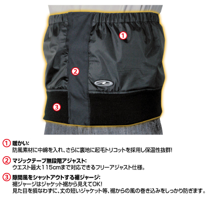ジャケットとからだのスキマを補強してくれるコモノグッズ。裾部はジャージでピッタリフィットしズリ上がりを防止。内側には起毛を施し、中綿でとても暖か。115cmまで対応のフリーアジャストで重ね着の上からでもしっかり保温出来ます。