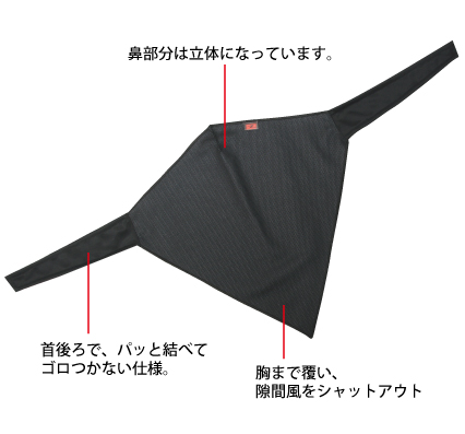 手軽に防風、簡易に防塵。ヘルメットの種類を問わずつかえるバンダナスタイルが使い易い、コストパフォーマンスに優れたマスクです。